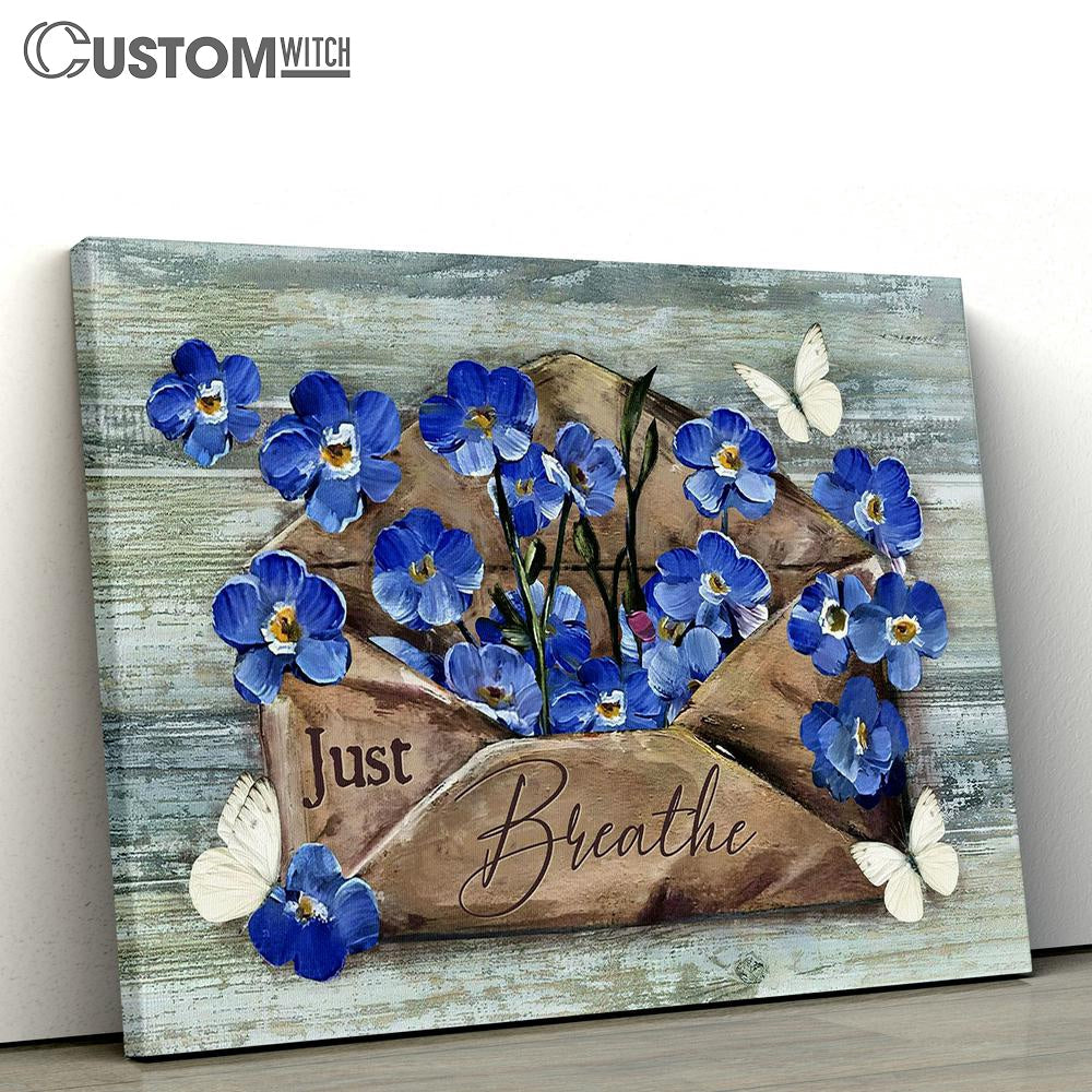 Just Breathe Blue Flower White Butterfly Canvas Wall Art - Bible Verse Canvas - Religious Prints