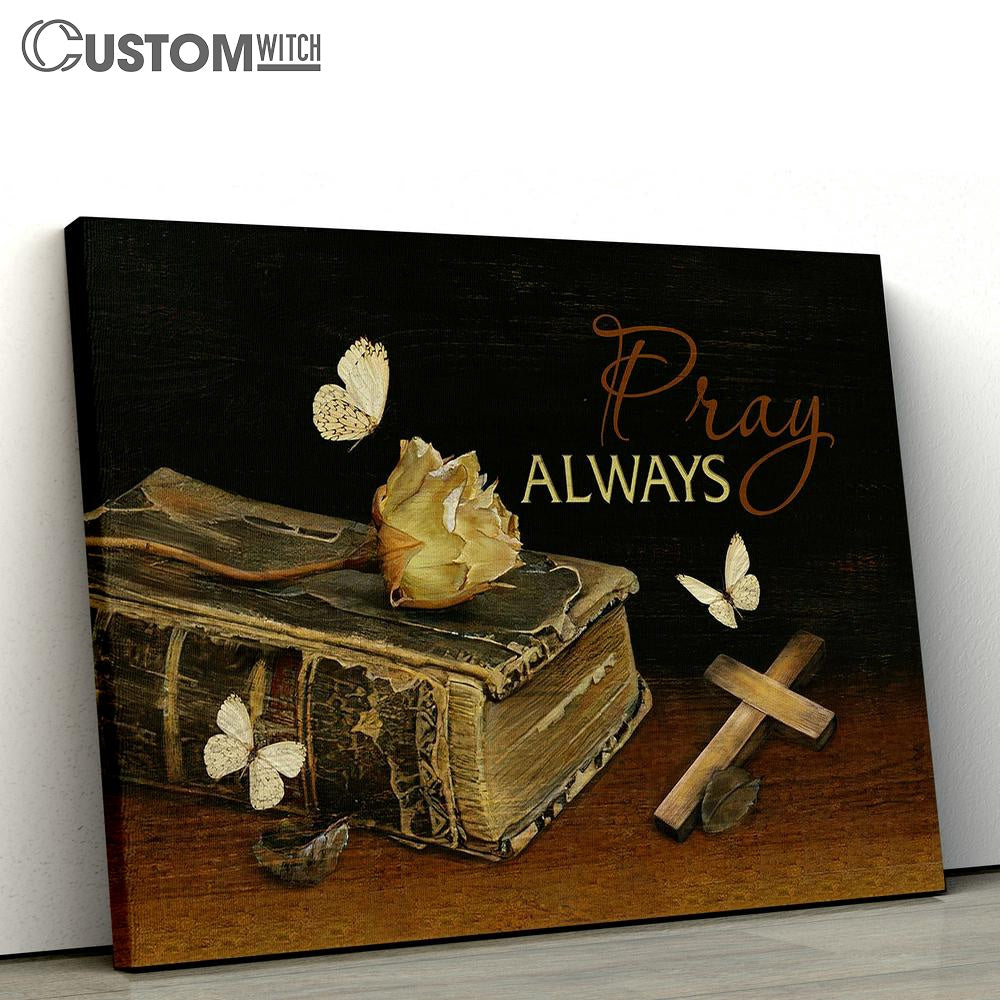 Pray Always Dried Rose Wooden Cross White Butterfly Book Bible Canvas Wall Art - Bible Verse Canvas - Religious Prints