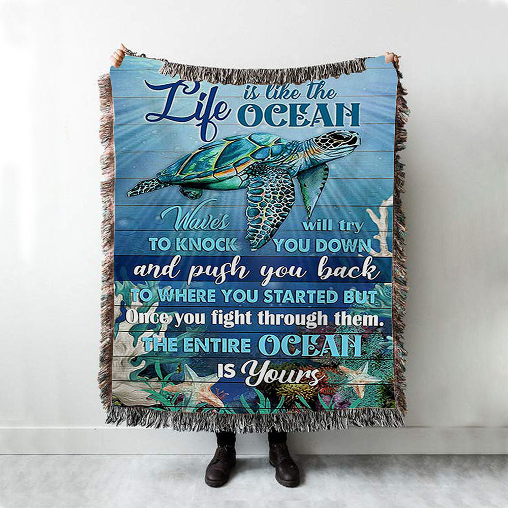 Sea Turtle Life Is Like The Ocean Woven Blanket Print - Inspirational Woven Blanket Art - Christian Throw Blanket Home Decor