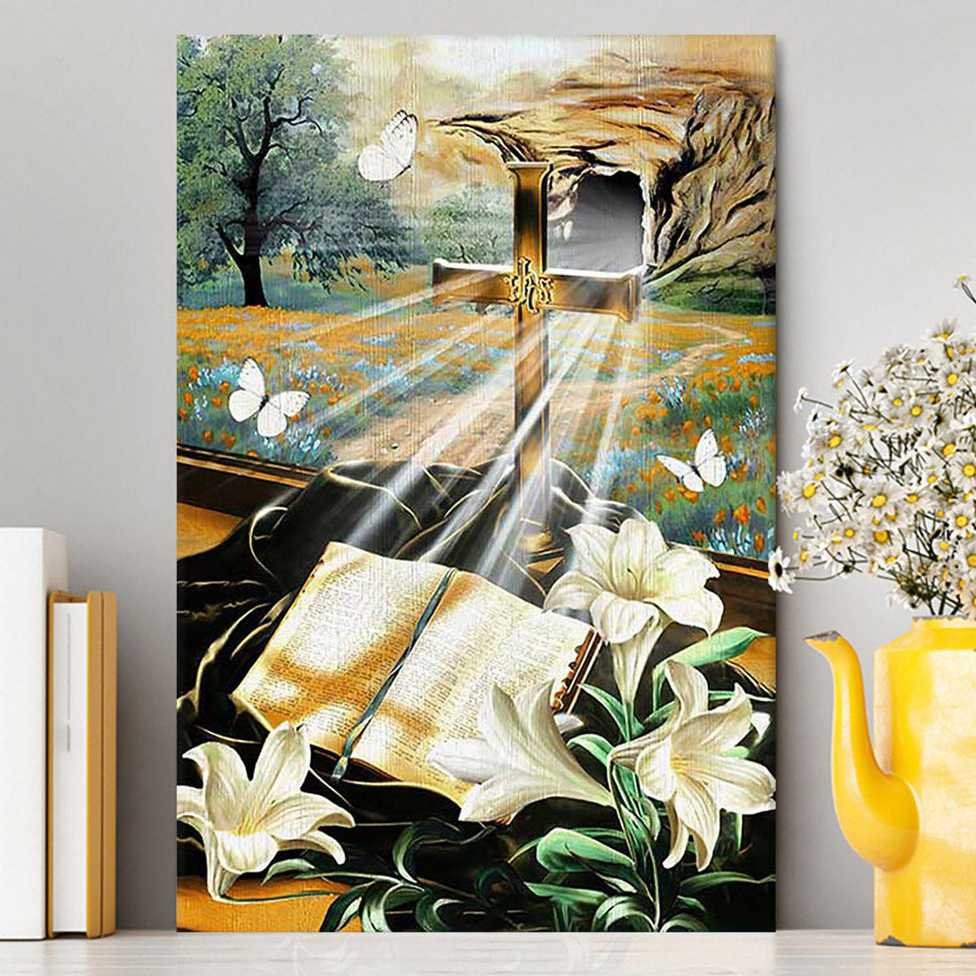 Bible Book Lily Flowers Golden Cross White Butterfly Canvas Wall Art - Bible Verse Canvas Art - Inspirational Art - Christian Home Decor