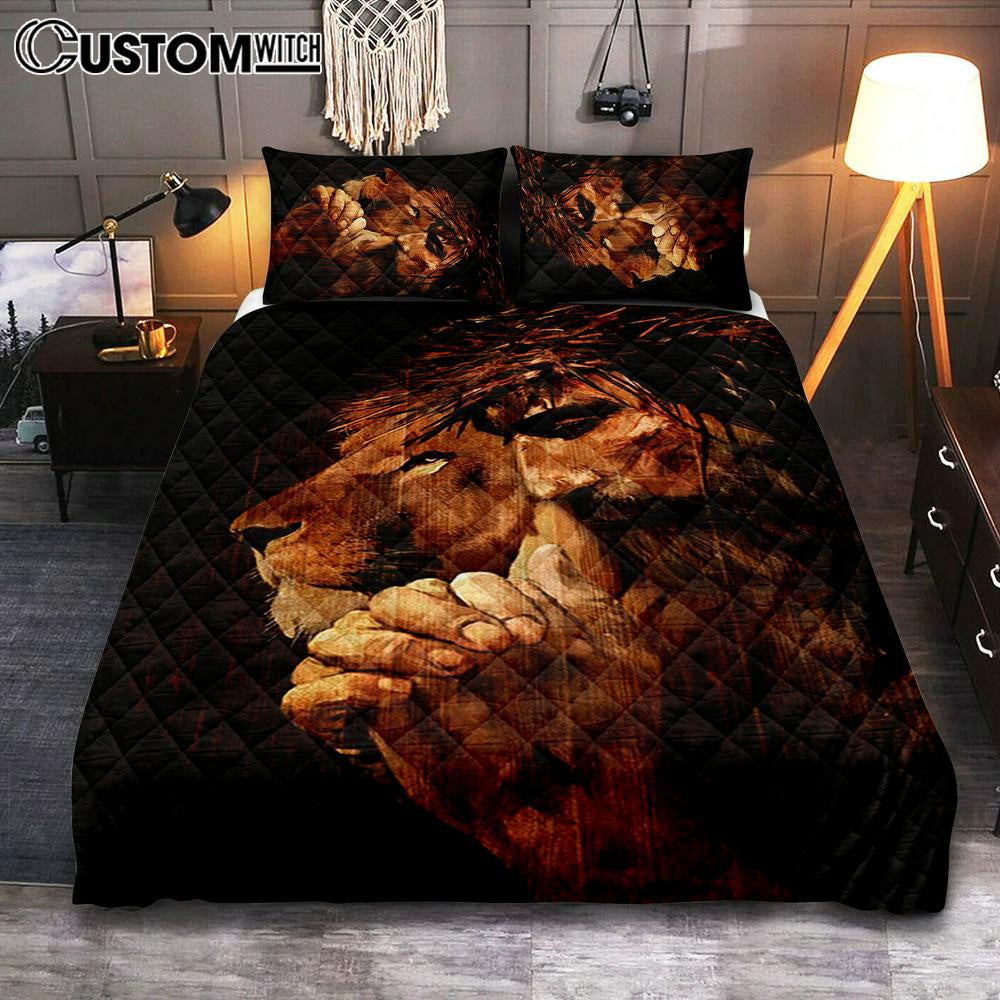 Jesus Praying And Lion Bedroom Quilt Bedding Set - Jesus Portrait Quilt Bedding Set Prints - Christian Bedroom