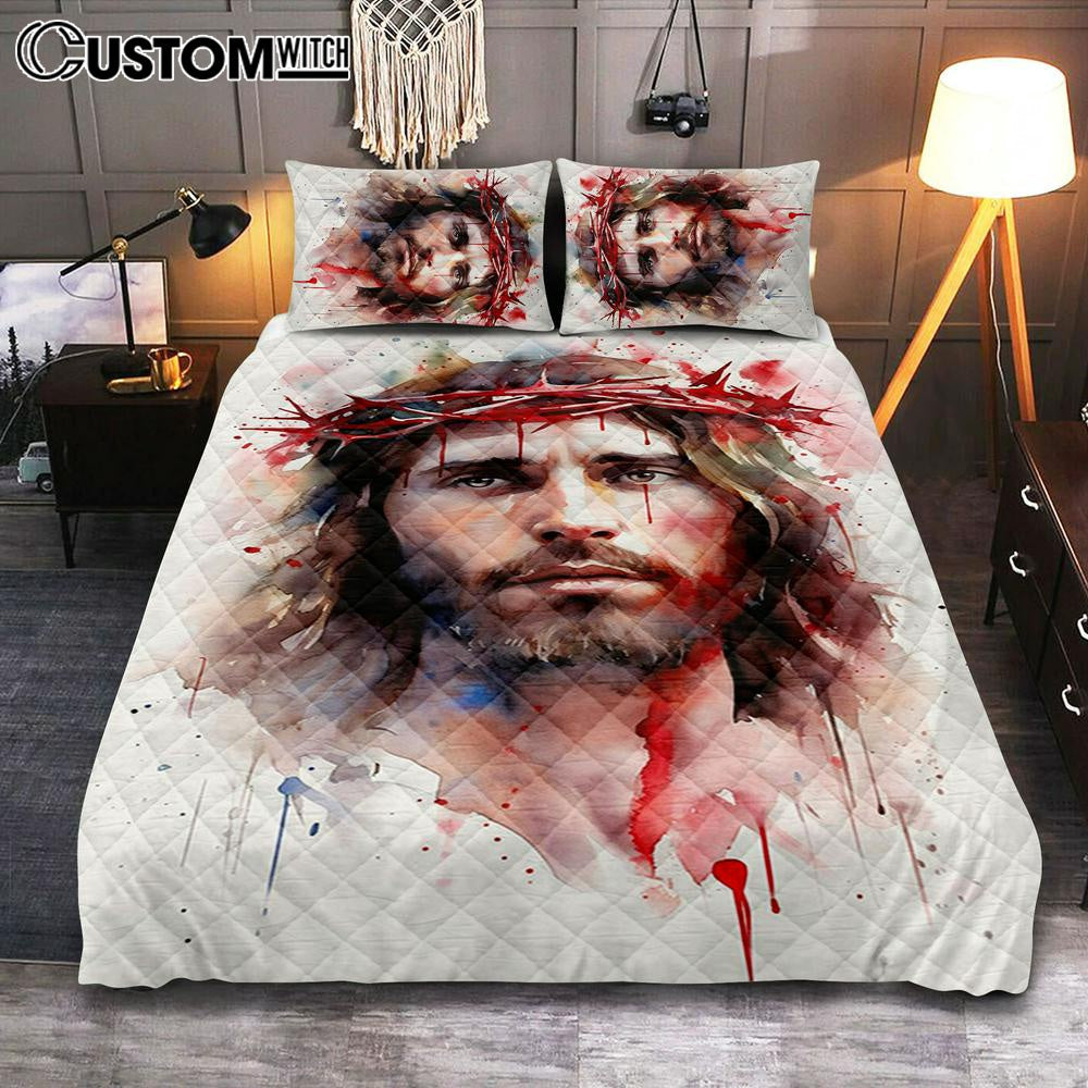 Jesus In Crown Of Thorns Watercolor Quilt Bedding Set Prints - Jesus Quilt Bedding Set Art - Christian Bedroom Decor