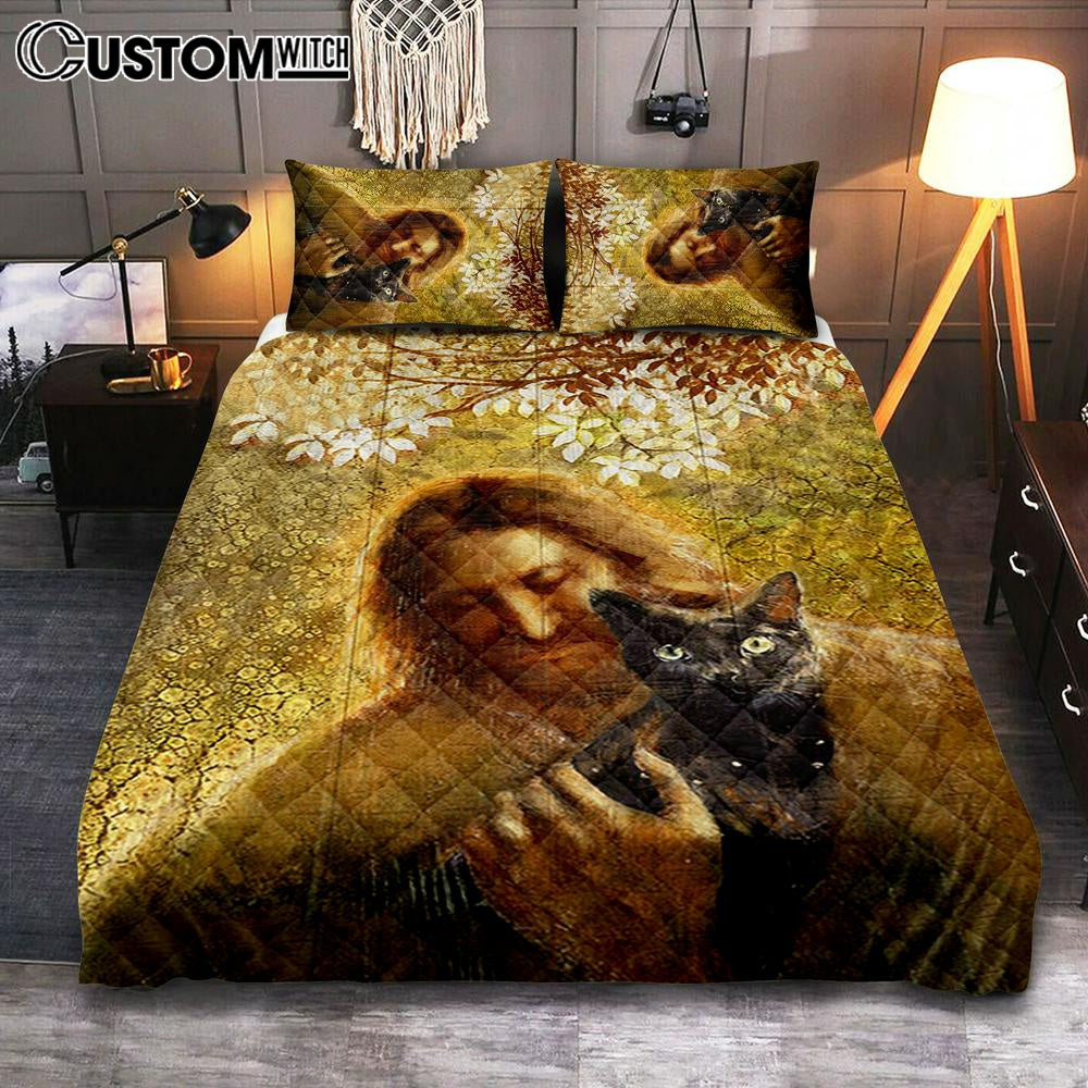 Jesus And Black Cat Quilt Bedding Set Bedroom - Bible Verse Quilt Bedding Set Art - Christian Home Decor