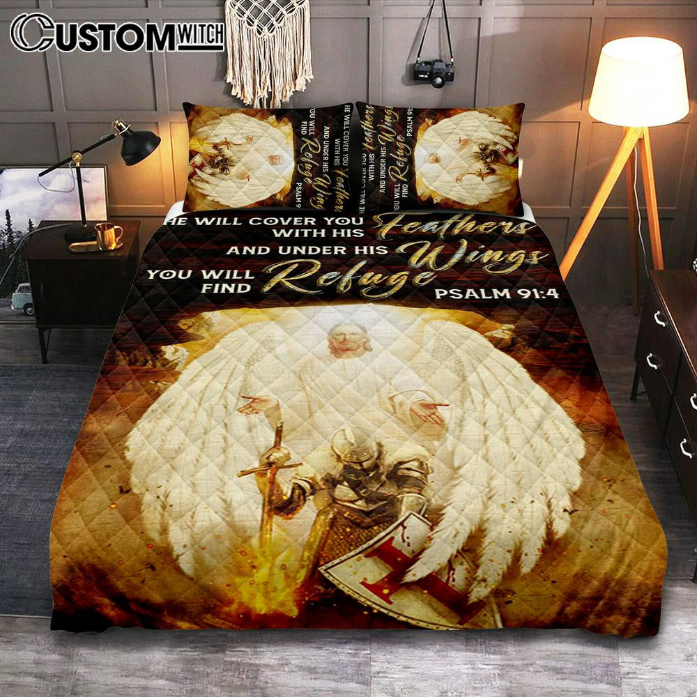 He Will Cover You With His Feathers Quilt Bedding Set - Jesus Angel Wings Warrior Quilt Bedding Set Bedroom - Christian Bedroom Decor - Religious Quilt Bedding Set Prints