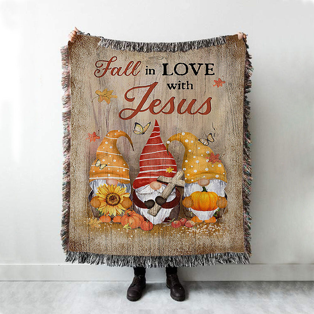 Autumn Gnome Wooden Cross Sunflower Butterfly - Fall In Love With Jesus Woven Throw Blanket - Christian Woven Blanket Prints