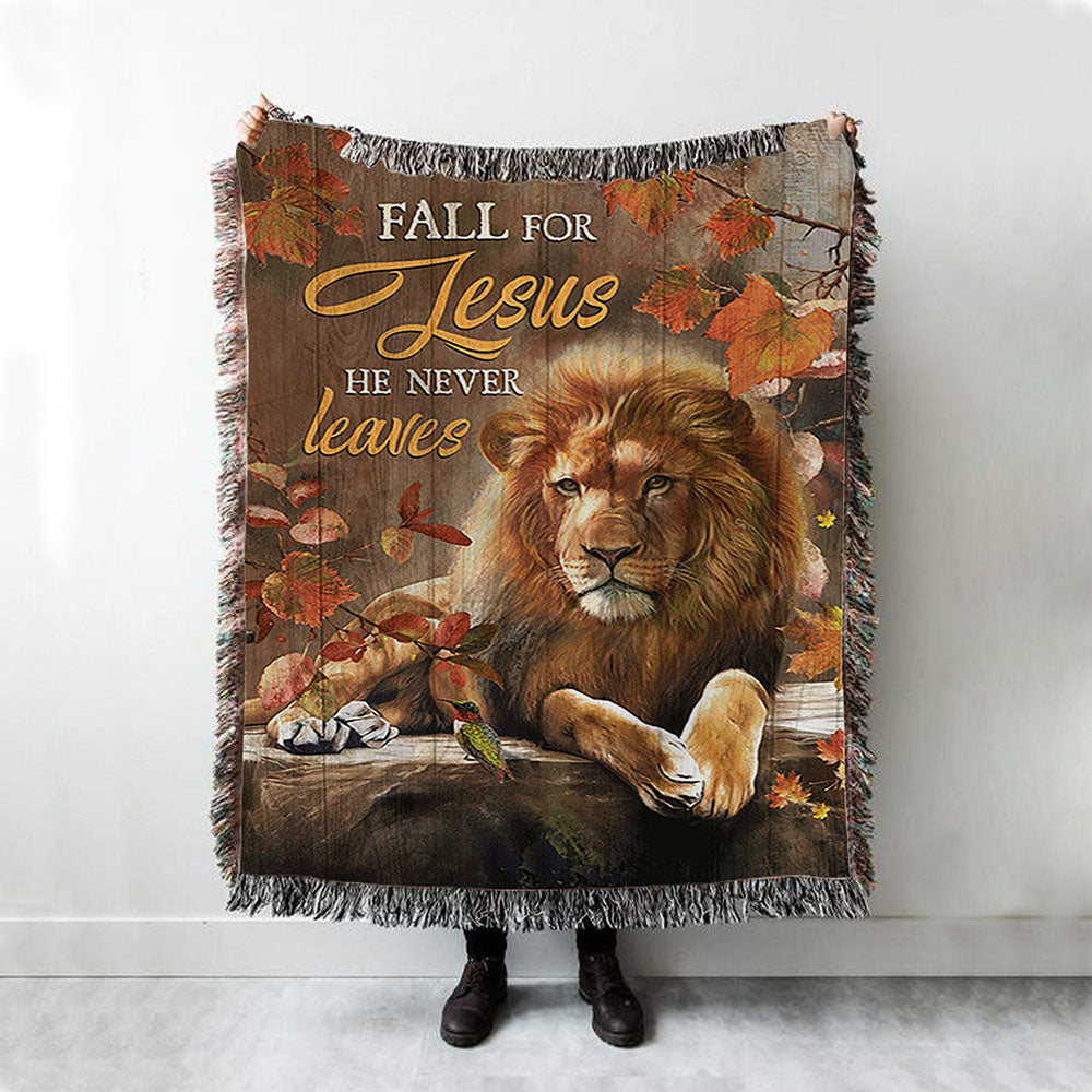 Autumn Season Lion Of Judah Autumn Leaves Fall For He Never Leaves Woven Throw Blanket - Christian Woven Blanket Prints