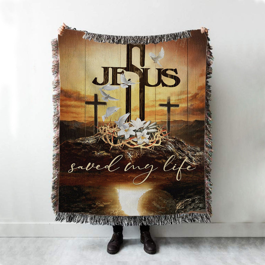 Jesus Saved My Life Woven Blanket - Cross Crown Of Thorns White Lily White Dove Woven Blanket Prints - Jesus Christ Blanket - Christian Boho Blanket