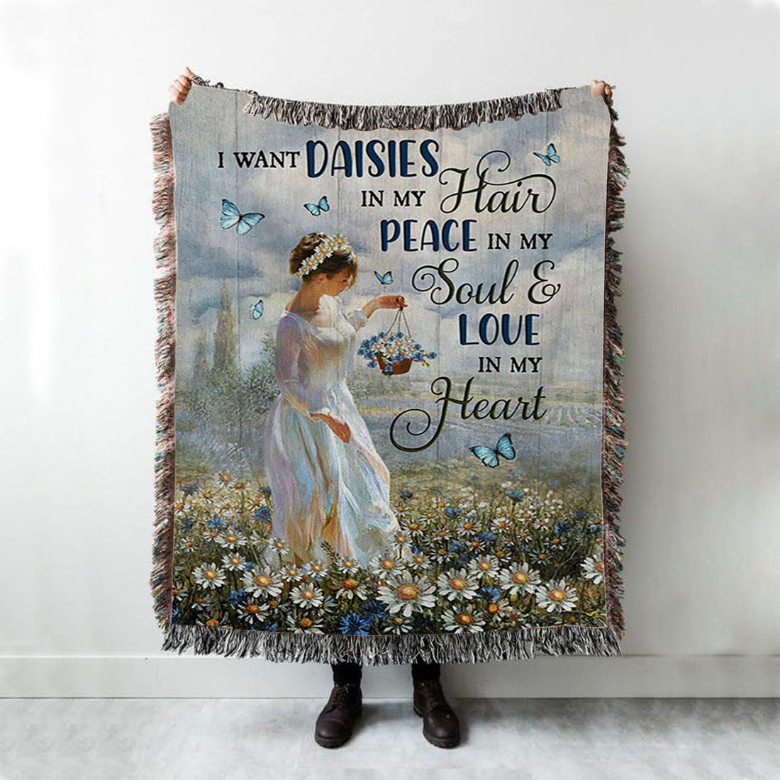 Daisy Field Blue Butterfly Woven Blanket- I Want Daisies In My Hair Woven Throw Blanket - Christian Woven Blanket Prints - Bible Verse Woven Blanket Art