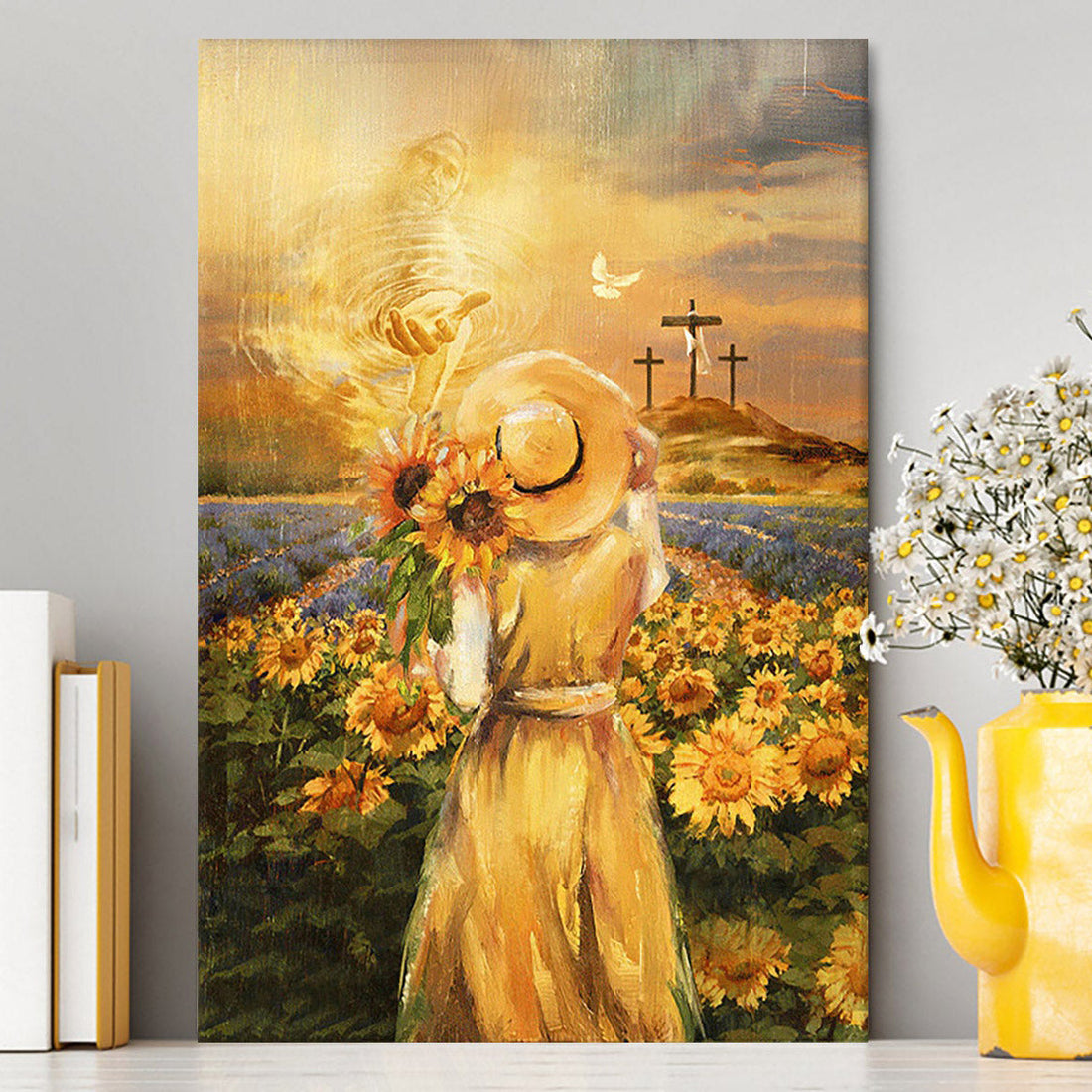 Jesus Hand Beautiful Girl Sunflower Field Cross Canvas Wall Art - Christian Canvas Prints - Bible Verse Canvas Art