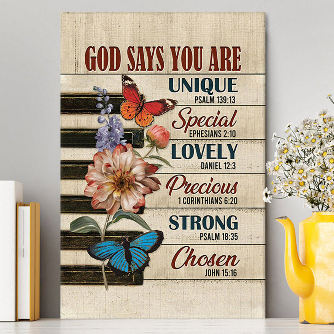 God Says You Are Piano Keys Gorgeous Butterfly Bible Verse Flowers Canvas Wall Art - Christian Canvas Prints