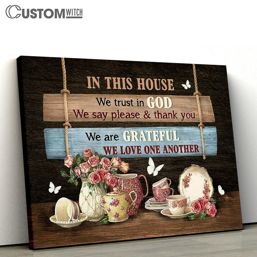 In This House We Trust In God Tea Cup White Butterfly Canvas Art - Bible Verse Wall Art - Wall Decor Christian