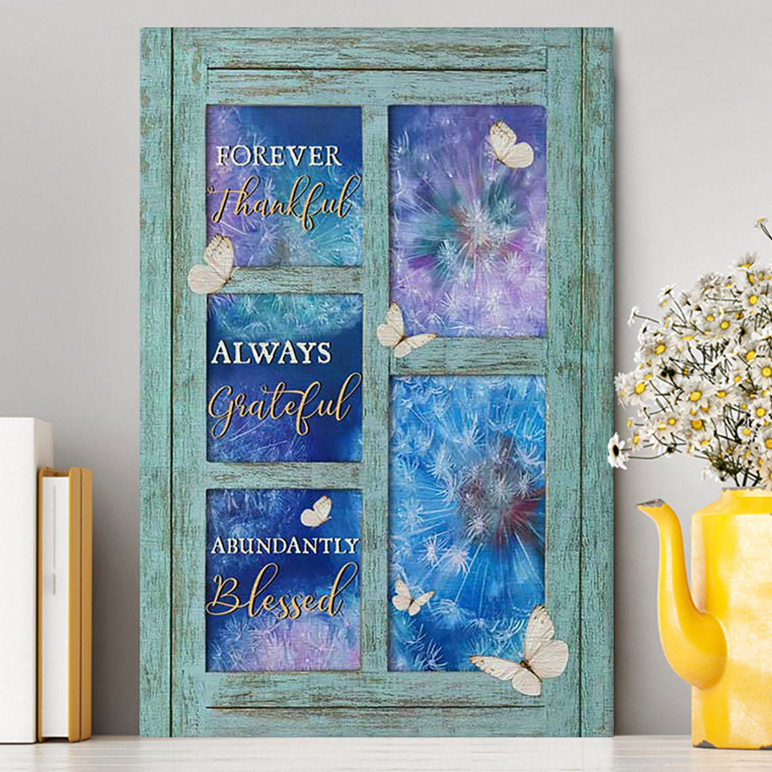 Blue Daisy, Glass Vase, Blue Butterfly, Window Scarf, Just Breathe Canvas, Christmas Gift for Christian