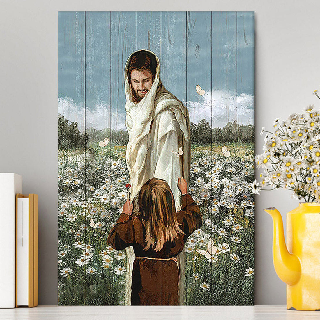 Happy Jesus Little Girl Daisy Field White Butterfly Canvas - Christian Wall Art - Religious Home Decor