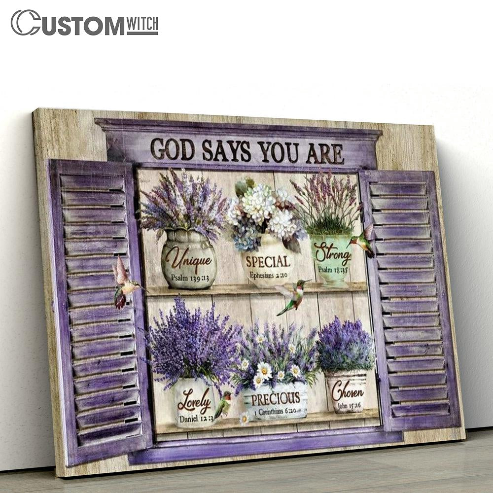 Lavender Vase, Hummingbird, Purple Window, God Says You Are Canvas Poster