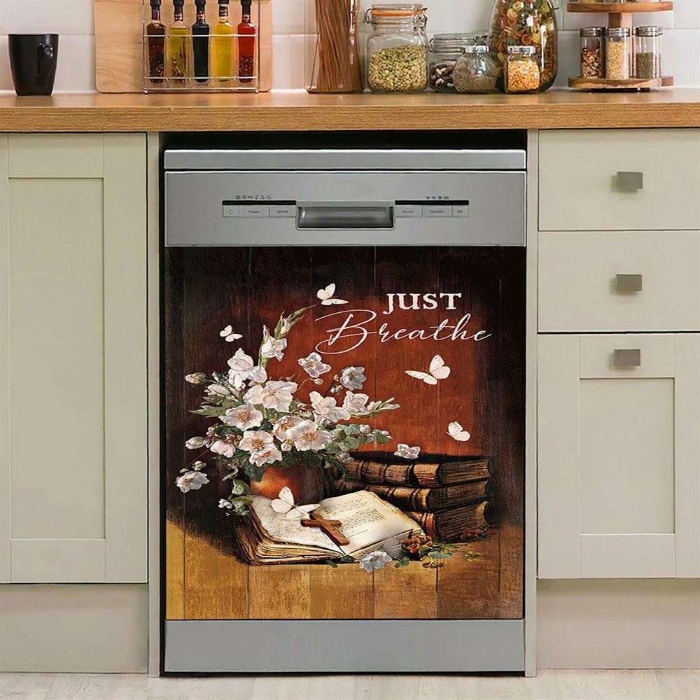 Just Breathe Flower Vase Butterfly Books Wooden Cross Dishwasher Cover, Bible Verse Dishwasher Wrap, Christian Kitchen Decoration