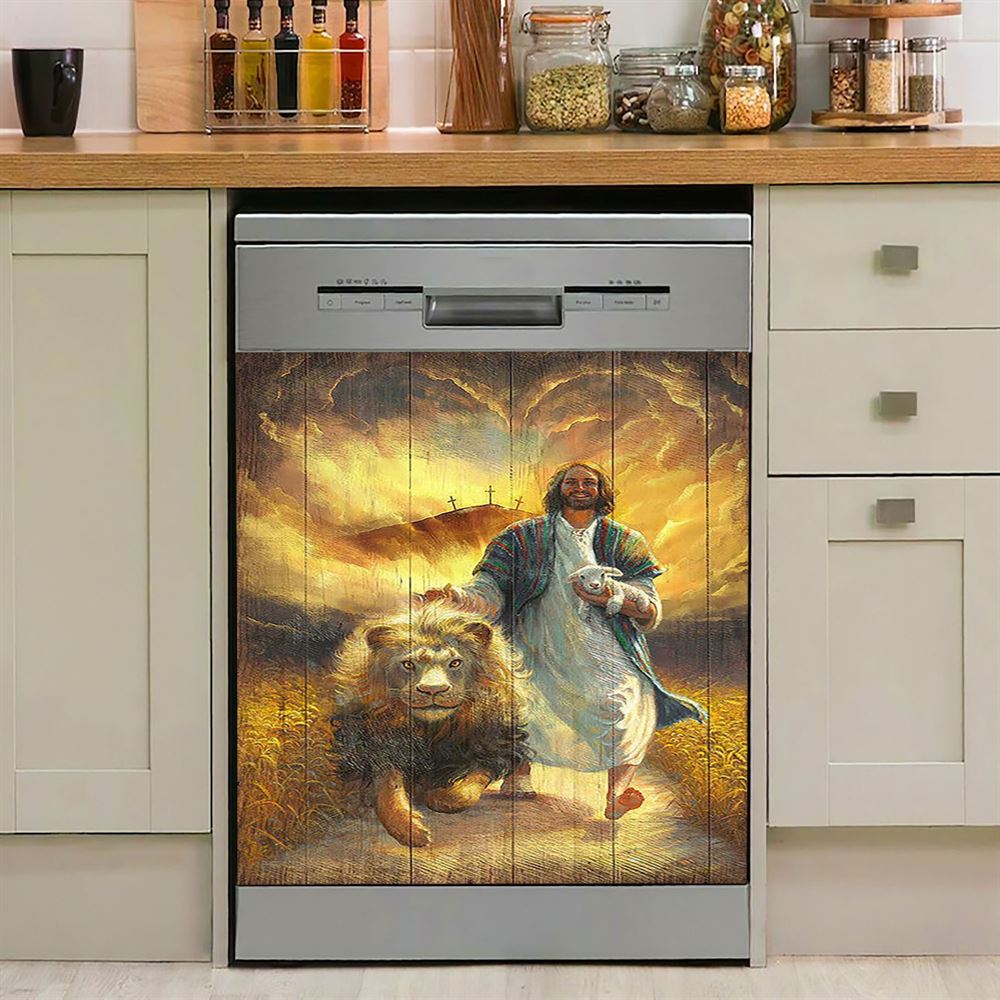 Jesus Walking With Lamb And Lion Dishwasher Cover, Christian Dishwasher Wrap, Bible Verse Kitchen Decoration