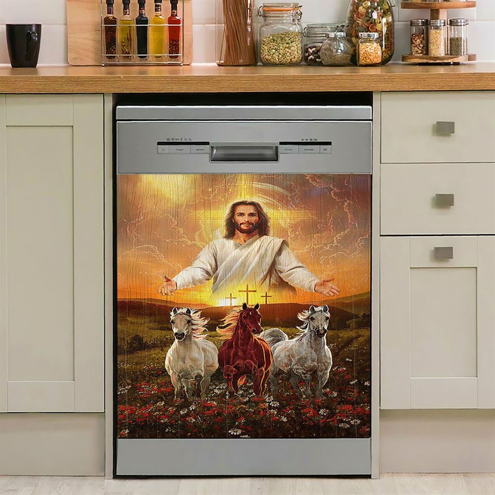 Jesus Three Wooden Crosses Gorgeous Horses Running At Sunrise Dishwasher Cover, Christian Dishwasher Wrap, Gift For Horse Lover