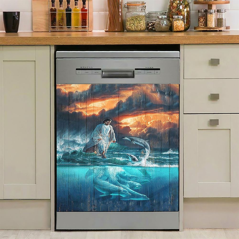 Jesus Walking On The Sea Dolphin Dishwasher Cover, Christian Dishwasher Wrap, Bible Verse Kitchen Decoration