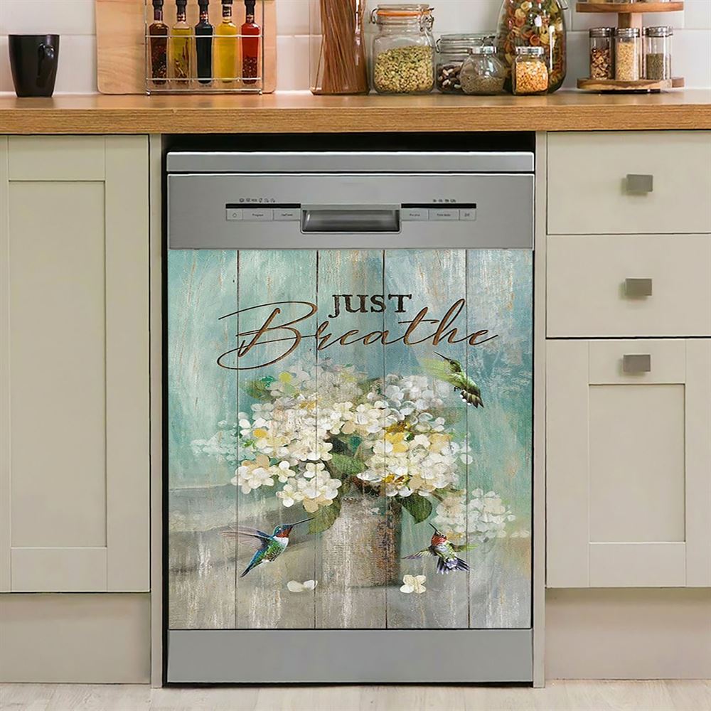 Hummingbird White Flower Just Breathe Dishwasher Cover, Christian Dishwasher Stickers, Bible Verse Kitchen Decor