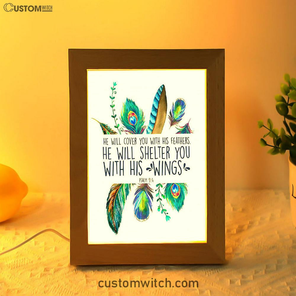 He Will Cover You With His Feathers Frame Lamp Art - Psalm 91 4 - Christian Night Light Decor