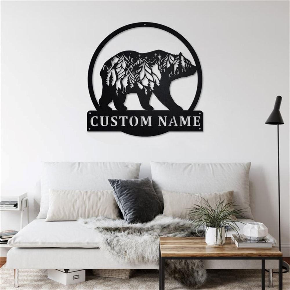 Personalized Metal Monogram Sign, Bear And Forest Decor Bear Metal Wall Decor, Night View Mountain Pattern Metal Wall Art, Bear Decor