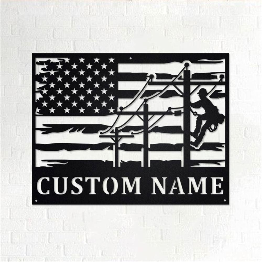 Personalized Metal Monogram Sign, Lineman USA Flag Round Metal Wall Art, Lineman Name Sign, Lineman Home Decor