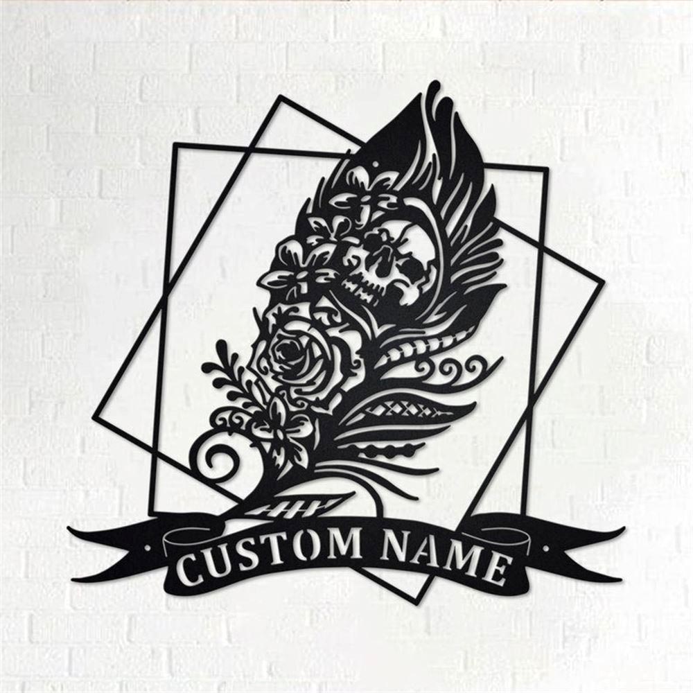 Personalized Metal Monogram Sign, Gothic Skull Feather Metal Wall Art, Gothic Skull Feather Name Sign, Feather Home Decor