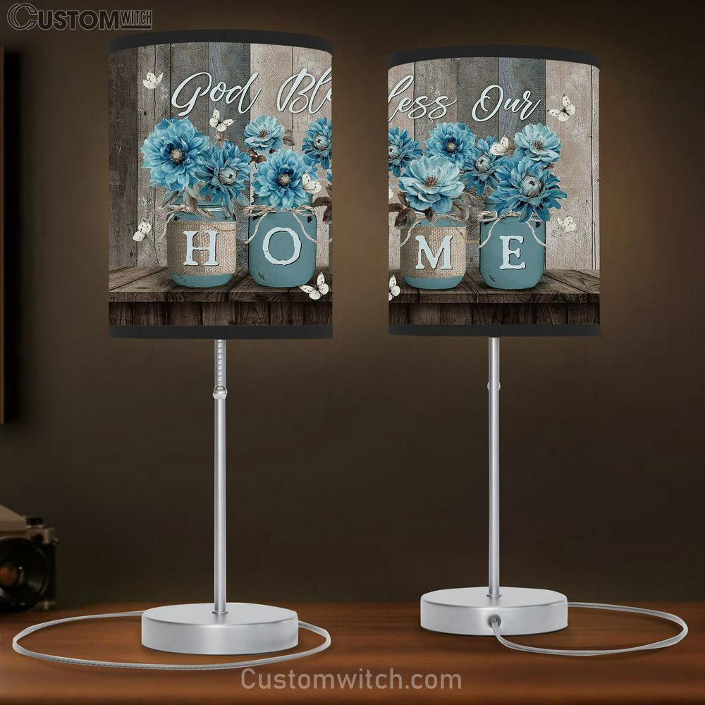 God Bless Our Home Blue Flower White Butterfly Mason Jars Table Lamp Gift - Bible Verse Table Lamp - Religious Bedroom Decor