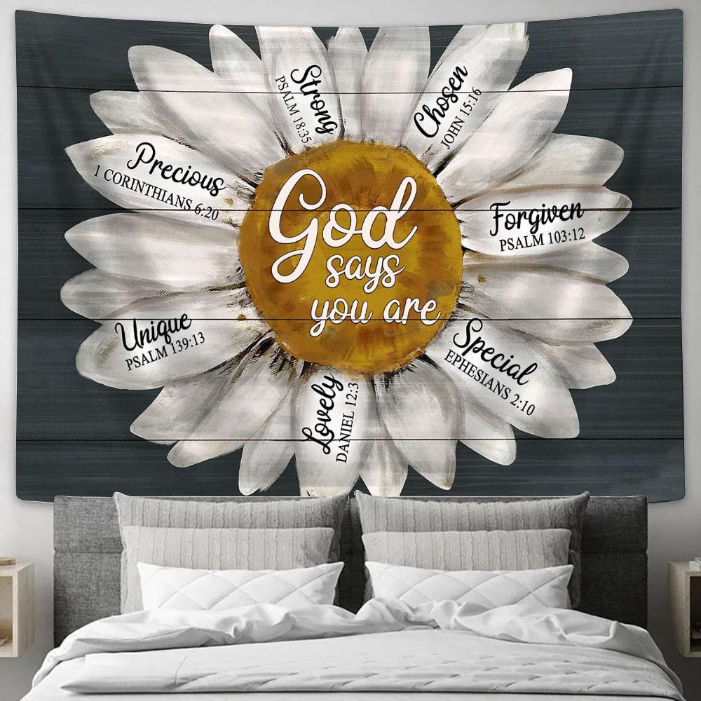 Daisy flower God says you are Tapestry Wall Art - Bible Verse Tapestry - Religious Tapestry Wall Hanging