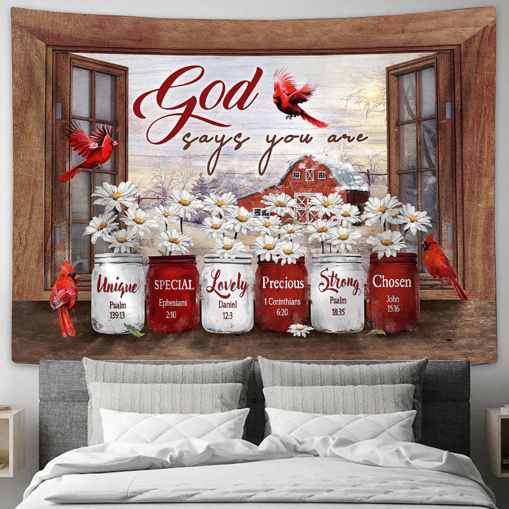 Daisy Flower Red Cardinal God Says You Are Tapestry Prints - Religious Tapestry Art - Christian Home Decor