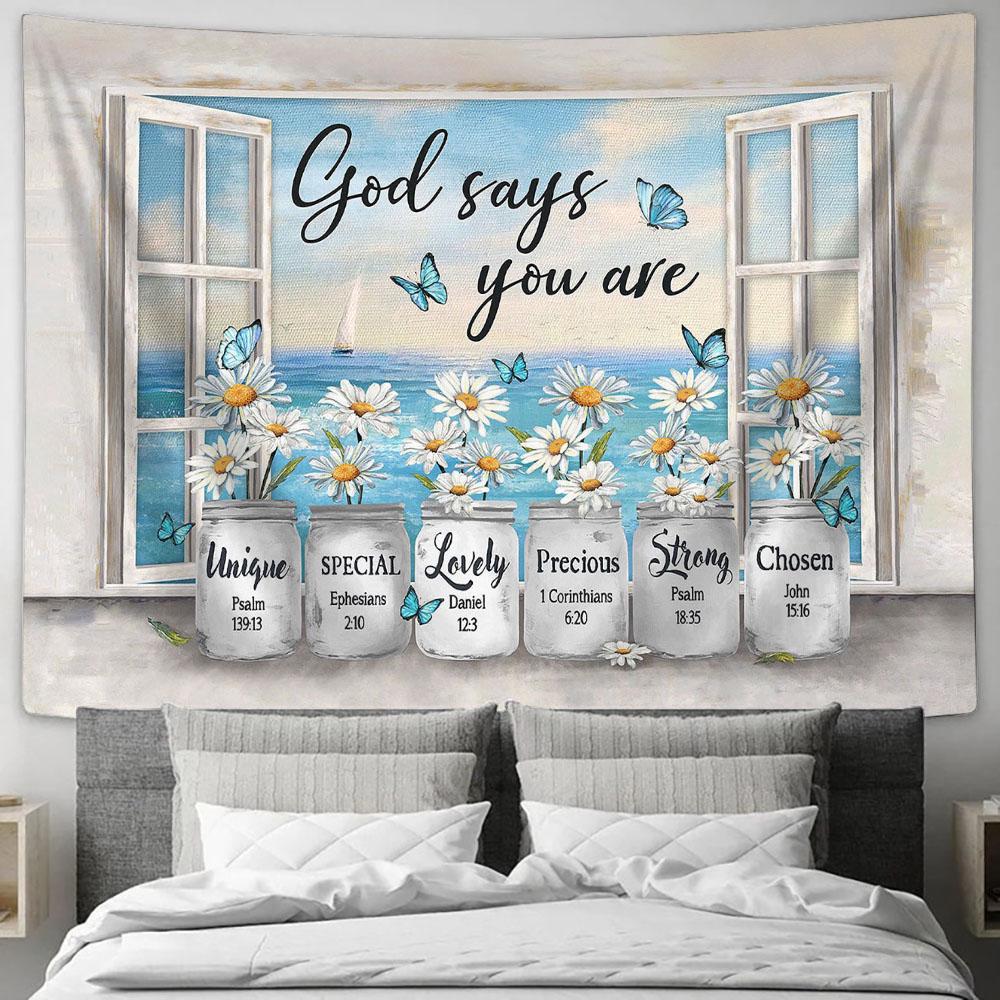 Daisy White Butterfly God Says You Are Tapestry Wall Art - Bible Verse Tapestry - Religious Tapestry Wall Hanging