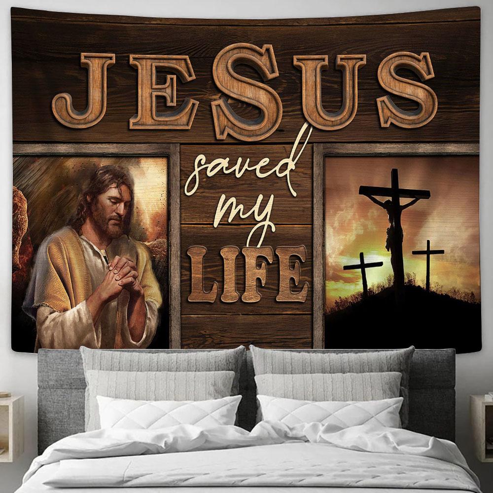 Crucifixion Of Jesus Three Crosses Jesus Saved My Life Tapestry Wall Art - Bible Verse Tapestry - Religious Tapestry Wall Hanging