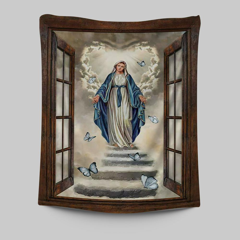 Maria Blue Butterfly Vintage Window The Way To Heaven Tapestry Print - Inspirational Tapestry Art - Christian Wall Art Home Decor