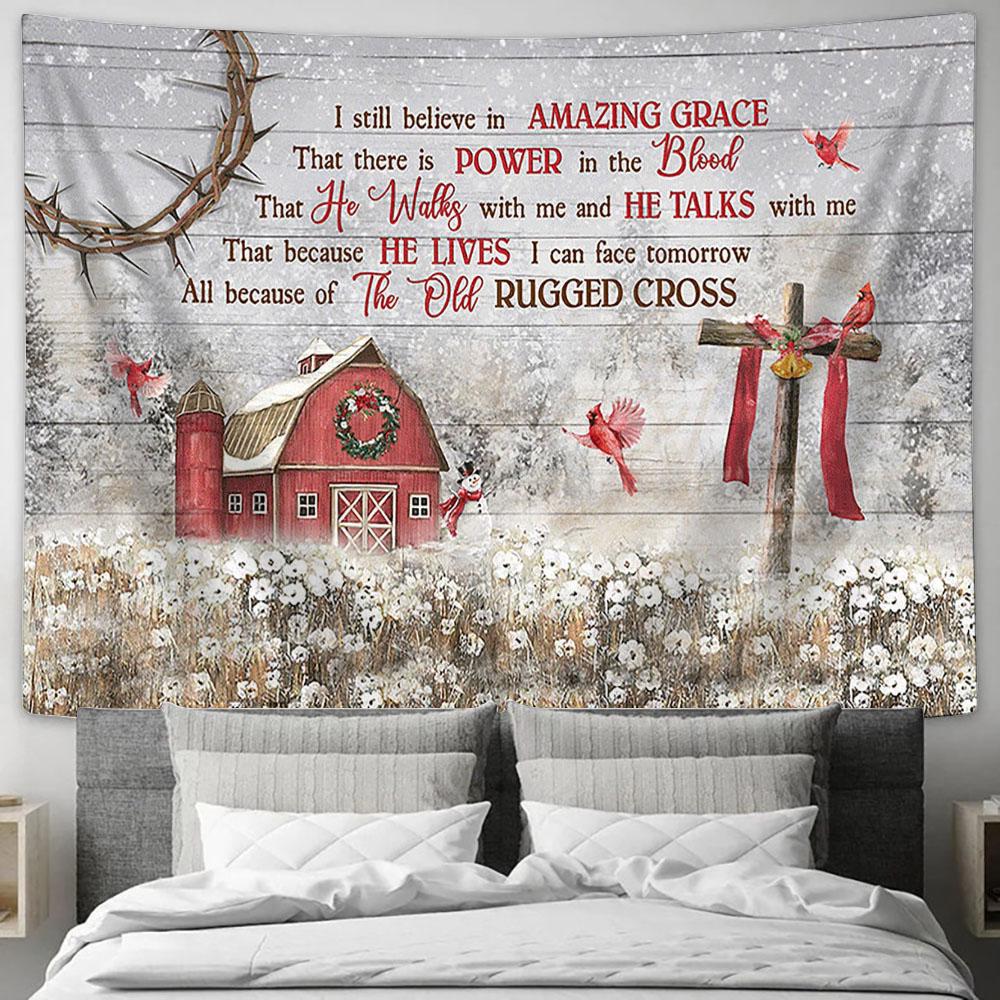 I Still Believe Amazing Grace Wooden Cross Barn House Tapestry Art - Christian Scripture Tapestry