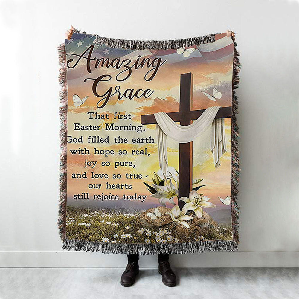 Amazing Grace Beautiful Cross Lily Flower Woven Throw Blanket - Bible Verse Woven Blanket Art - Inspirational Art - Christian Home Decor