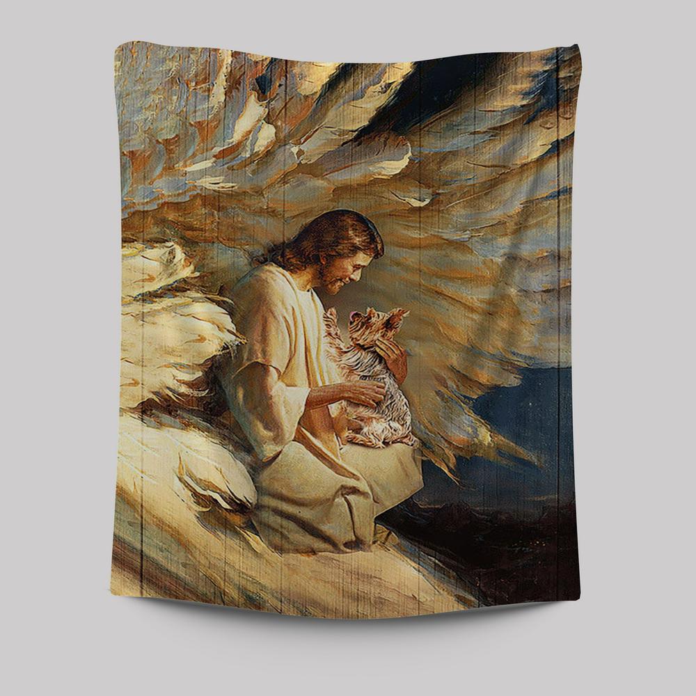 Angel Wings Little Yorkshire Terrier Jesus Painting Tapestry Wall Art - Christian Tapestries Prints - Bible Verse Tapestry Art