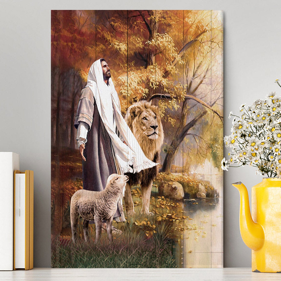 Animal Of God Stunning Lion White Lamb Autumn Forest Canvas Wall Art - Christian Canvas Prints