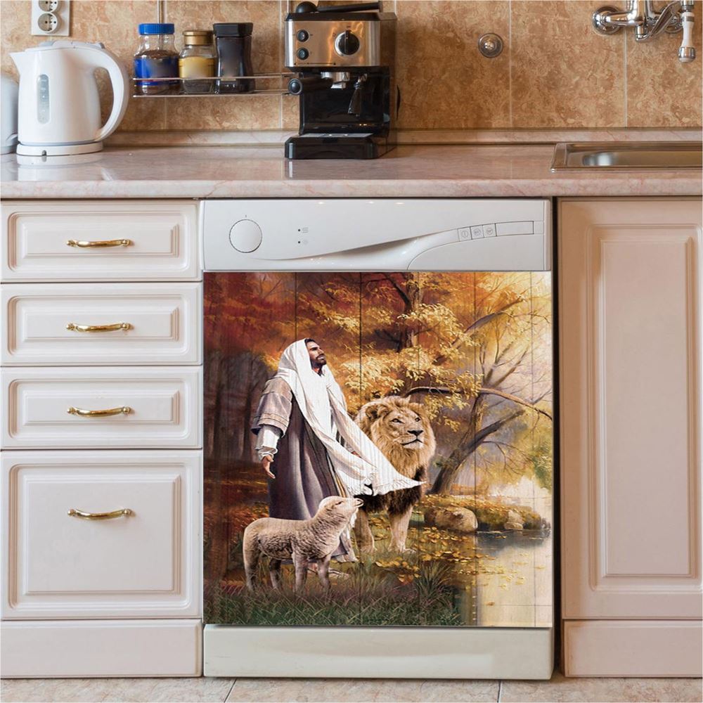 Animal Of God Stunning Lion White Lamb Autumn Forest Dishwasher Cover, Christian Dishwasher Magnet Cover