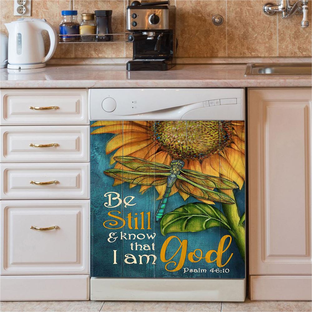 Be Still And Know That I Am God Sunflower Dragonfly Dishwasher Cover, Christian Dishwasher Magnet Cover, Bible Verse Kitchen Decor
