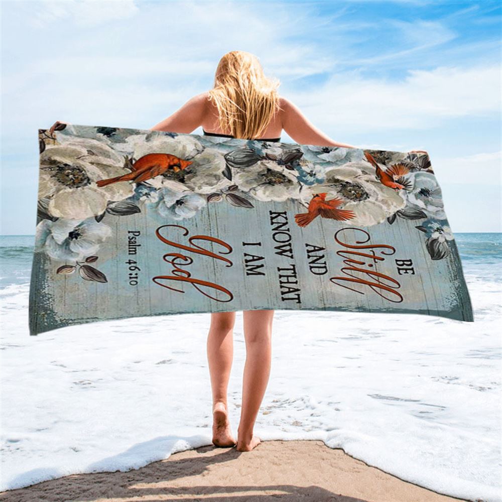 Be Still And Know That I Am God White Jasmine Pretty Cardinal Beach Towel - Bible Verse Beach Towel - Christian Inspirational Beach Towel