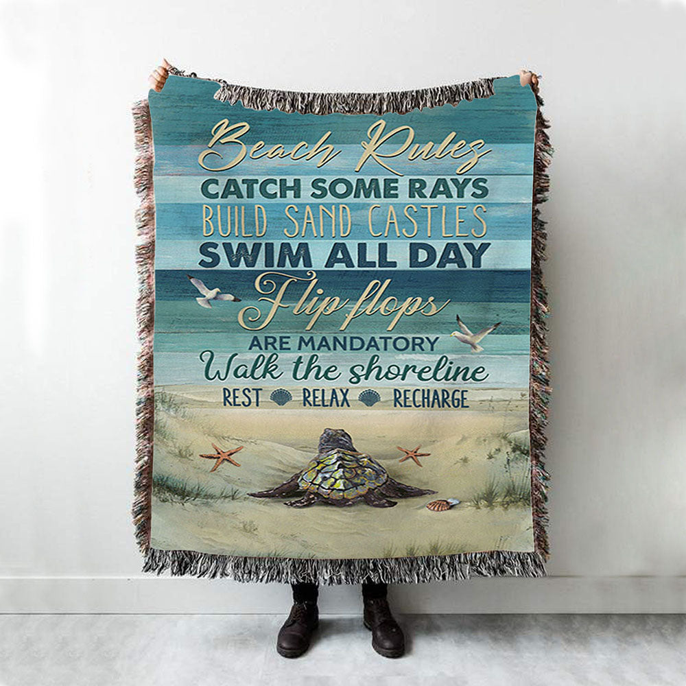 Beach Rules Baby Sea Turtle Sea Life Seagulls Woven Throw Blanket - Christian Woven Blanket Prints - Bible Verse Woven Blanket Art