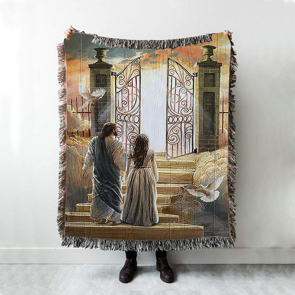 Beautiful Woman And Jesus Flying Dove Heaven Door Woven Throw Blanket - Bible Verse Woven Blanket Art - Inspirational Art - Christian Home Decor
