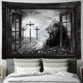 Black And White Lion And Lamb Of God Three Rugged Crosses Wall Art Tapestry - Christian Wall Art - Religious Art