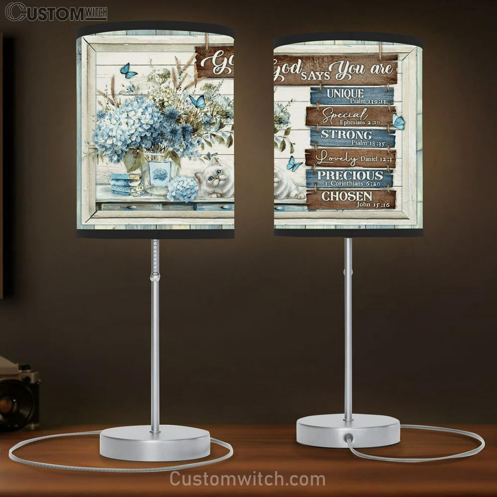 Cat And Flower - God Says You Are Unique, Special, Lovely, Precious, Strong, Chosen Table Lamp