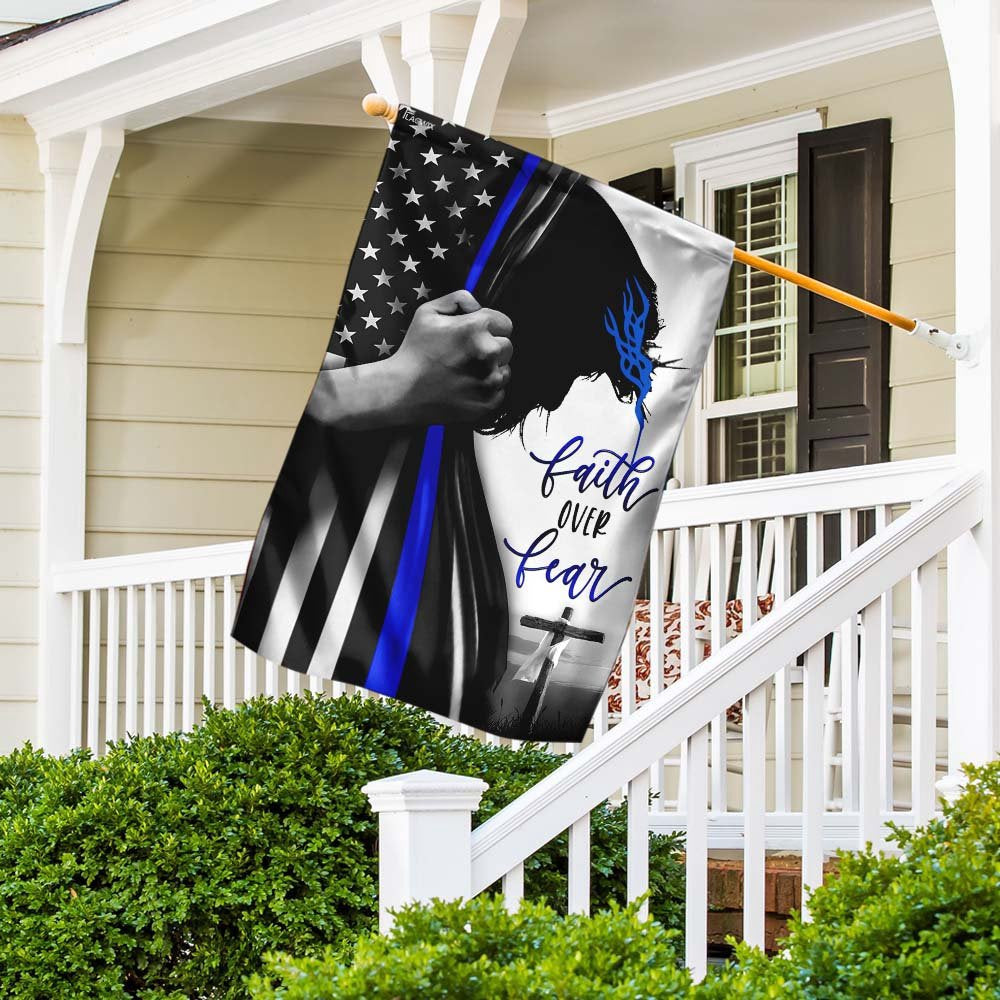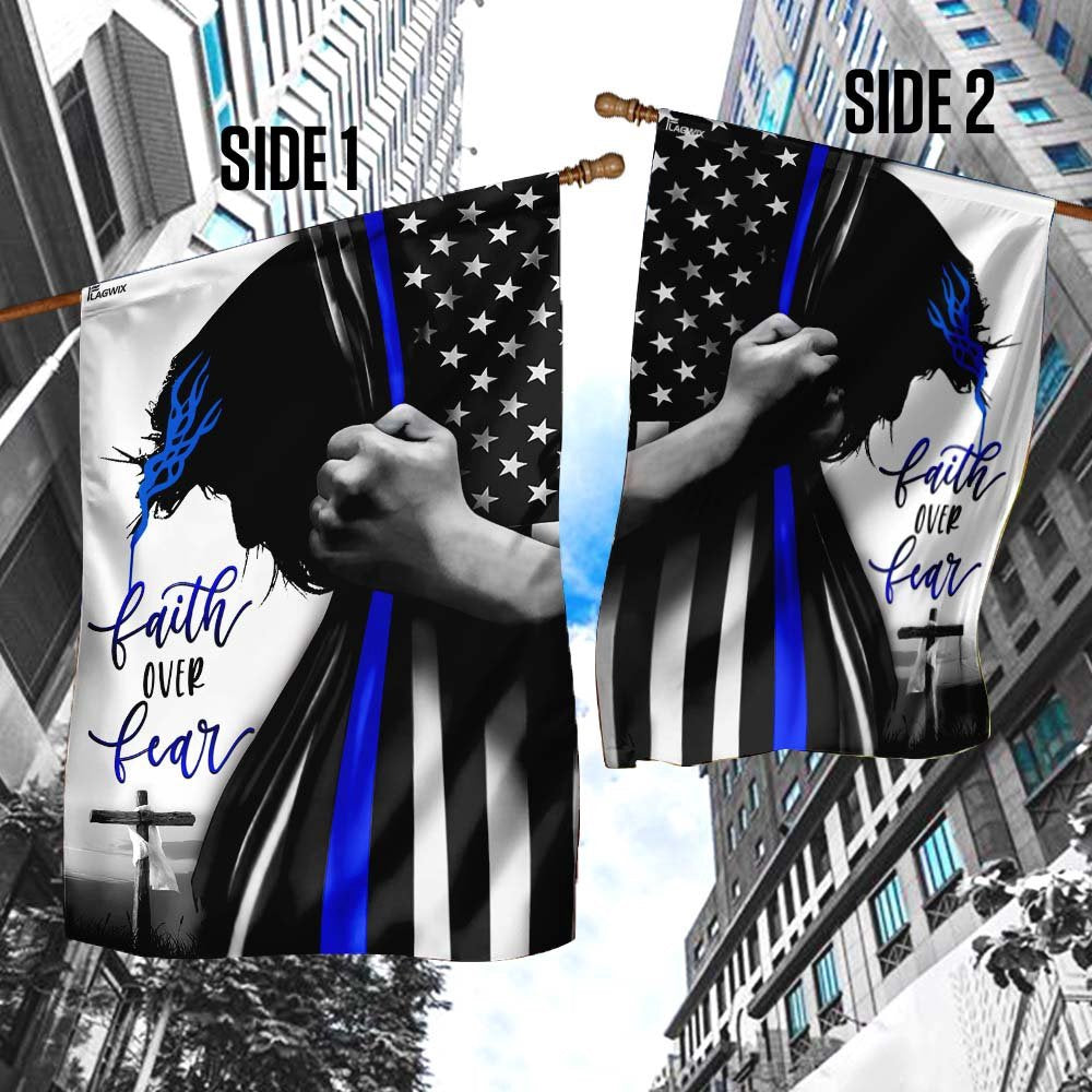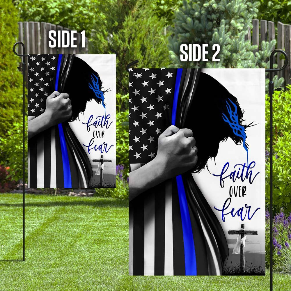 Christian Garden Flags, Faith Over Fear - Thin Blue Line Flag, Christian House Flags, Christian Cross Flag, Faith Flag