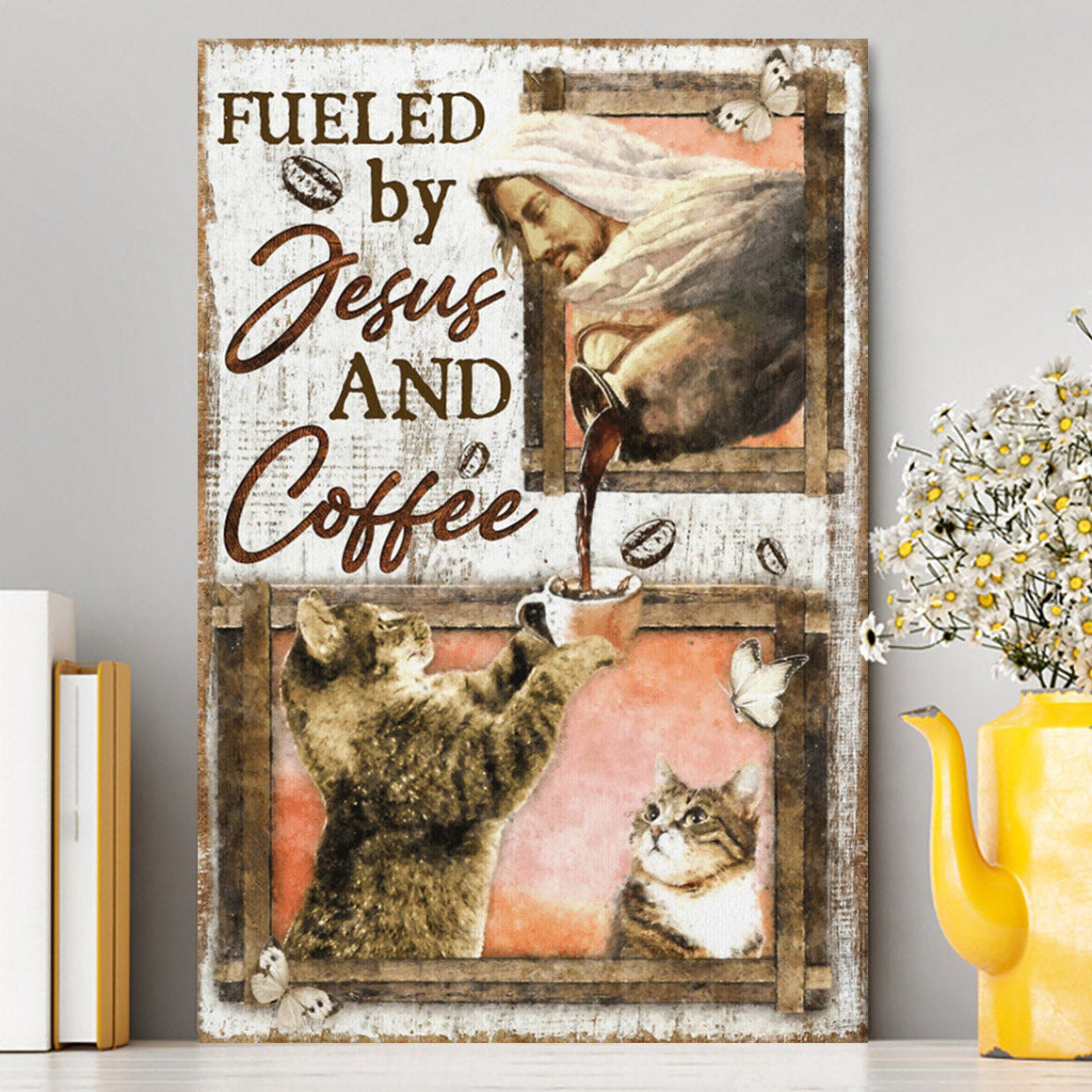 Fueled By Jesus And Coffee Cat Canvas Wall Art - Christian Wall Art Decor - Religious Canvas Prints