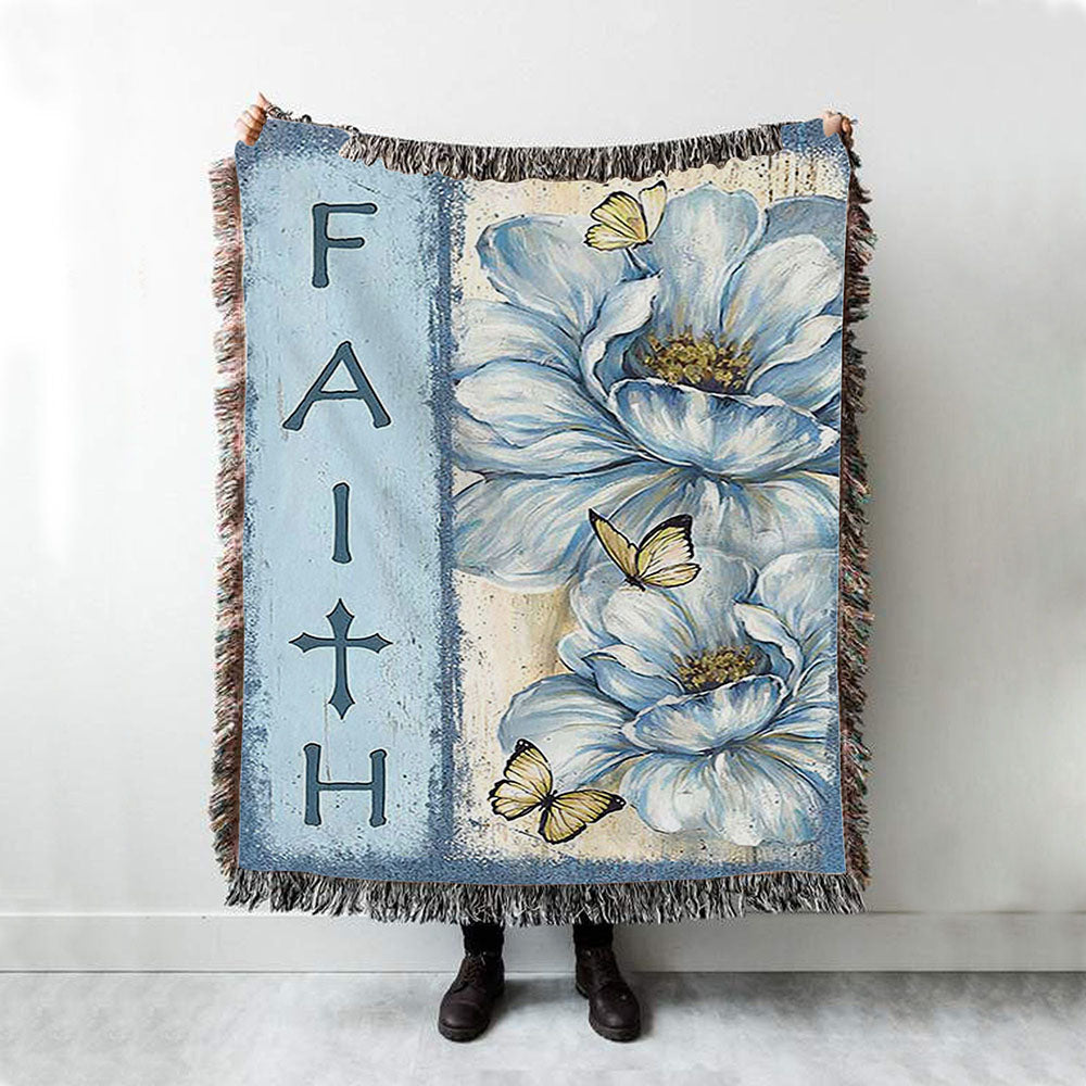 Faith White Flower Pretty Butterfly Woven Blanket Art - Bible Verse Throw Blanket - Christian Inspirational Boho Blanket