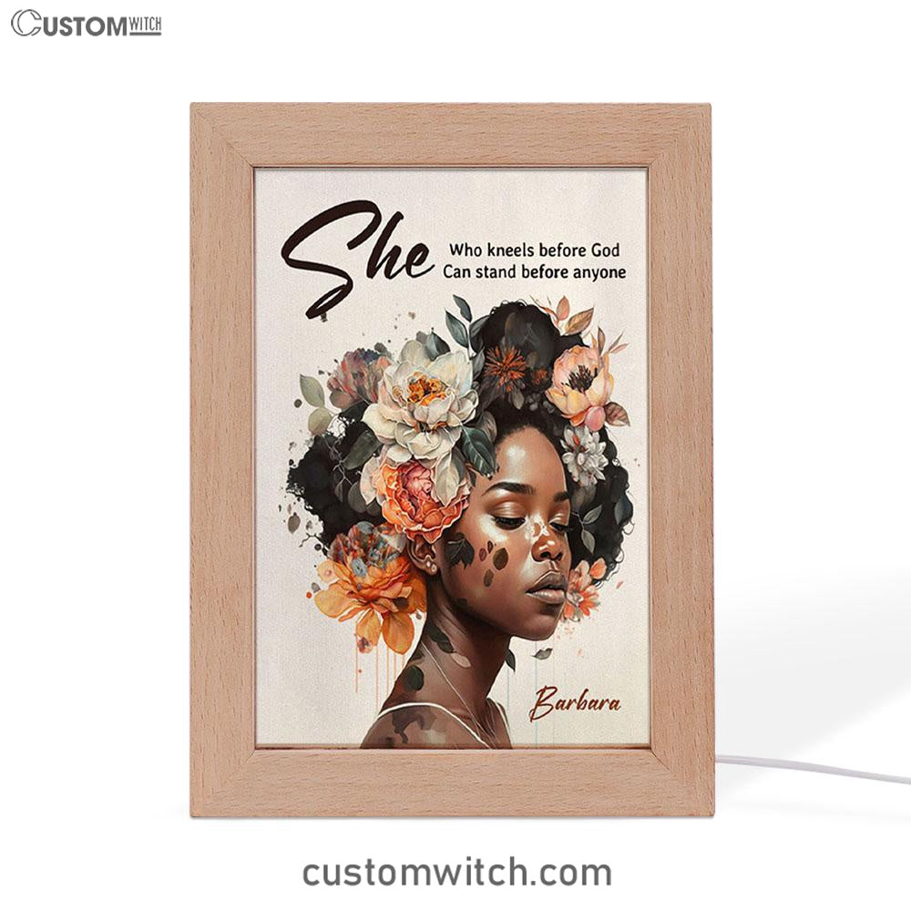 Gift For Women Of God She Who Kneels Before God Can Stand Before Anyone Personalized Frame Lamp Art