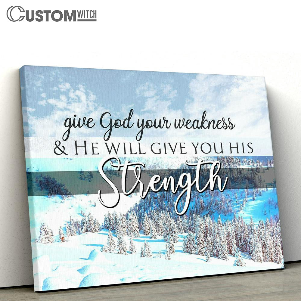 Give God Your Weakness And He Will Give You His Strength Snowland Canvas Wall Art - Christian Wall Canvas - Scripture Canvas Prints