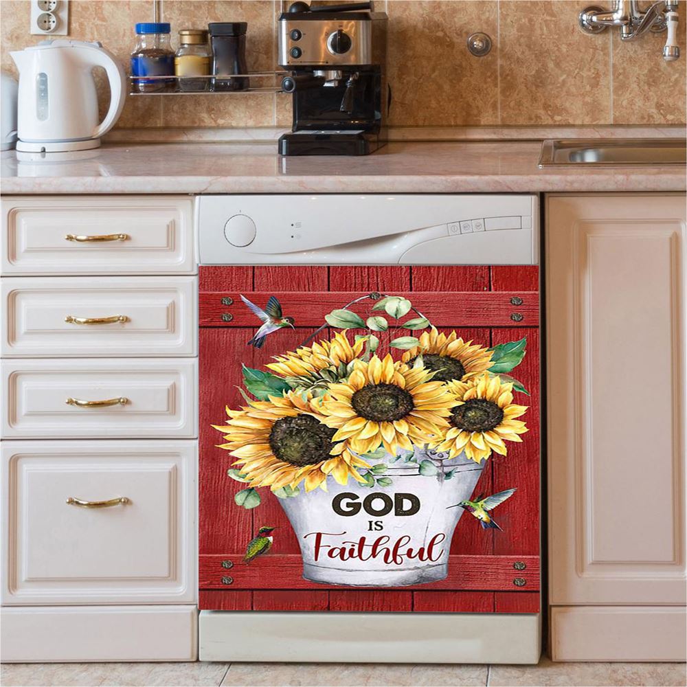 God Is Faithful Sunflower Hummingbird Dishwasher Cover, Bible Verse Dishwasher Stickers, Inspirational Kitchen Decor